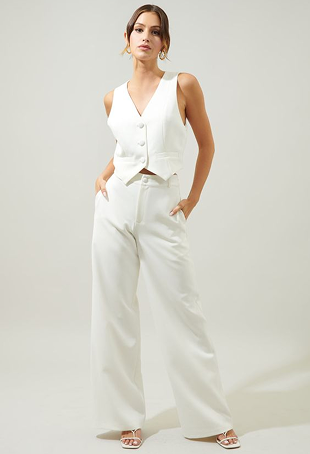 طقم نسائي أنيق باللون الأبيض، يتكوّن من فيست بدون أكمام مع بنطلون واسع الساق، ليمنحك إطلالة متوازنة تجمع بين الراحة والرقي.